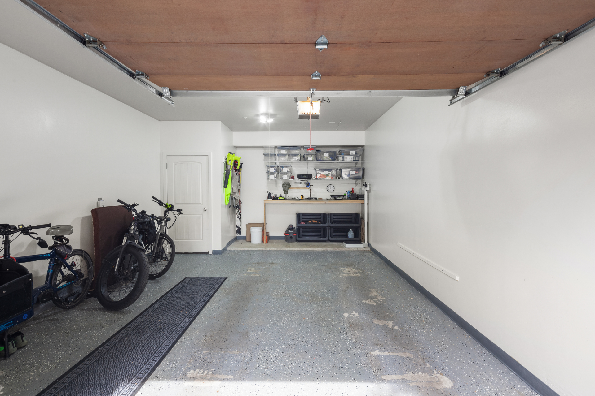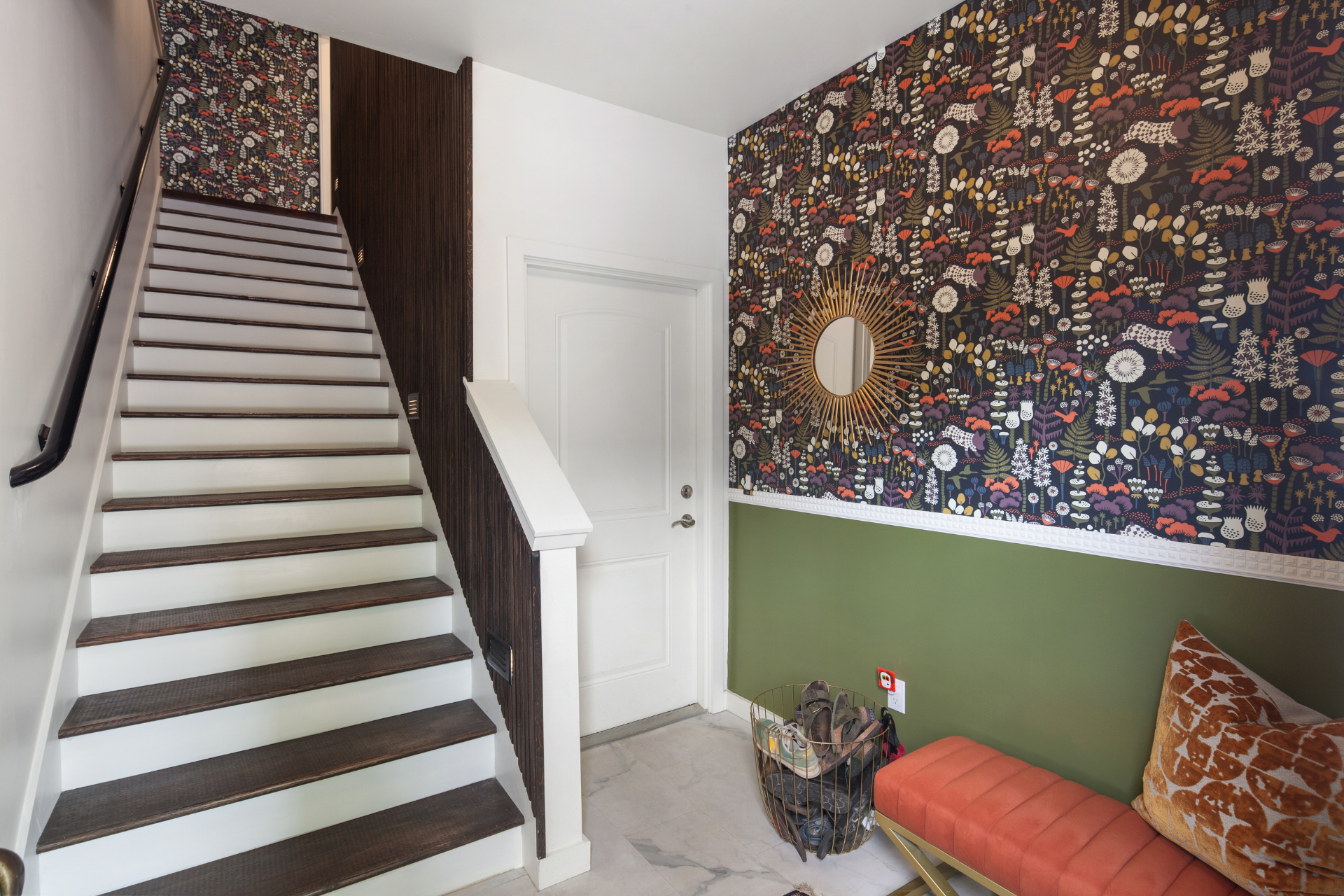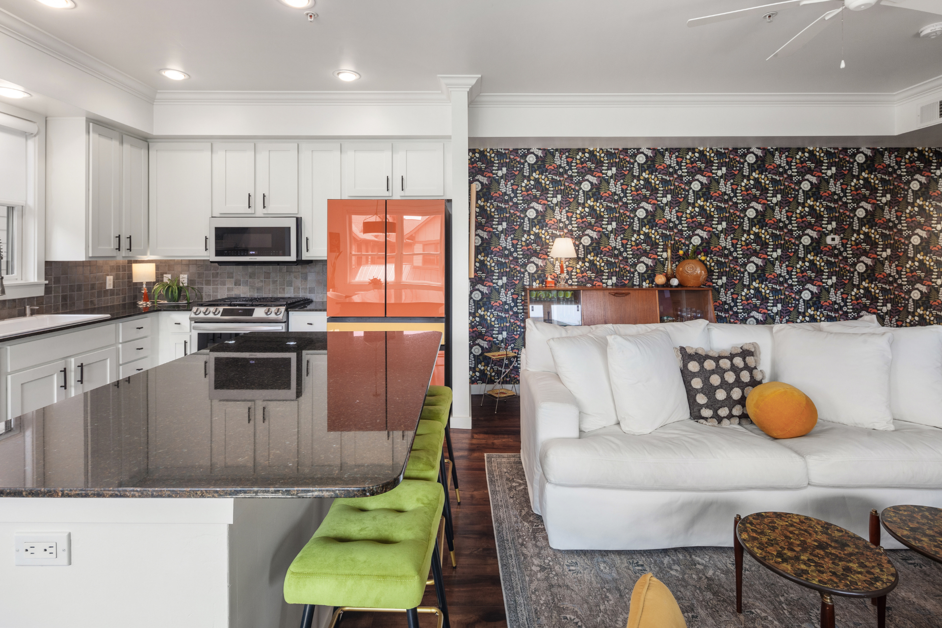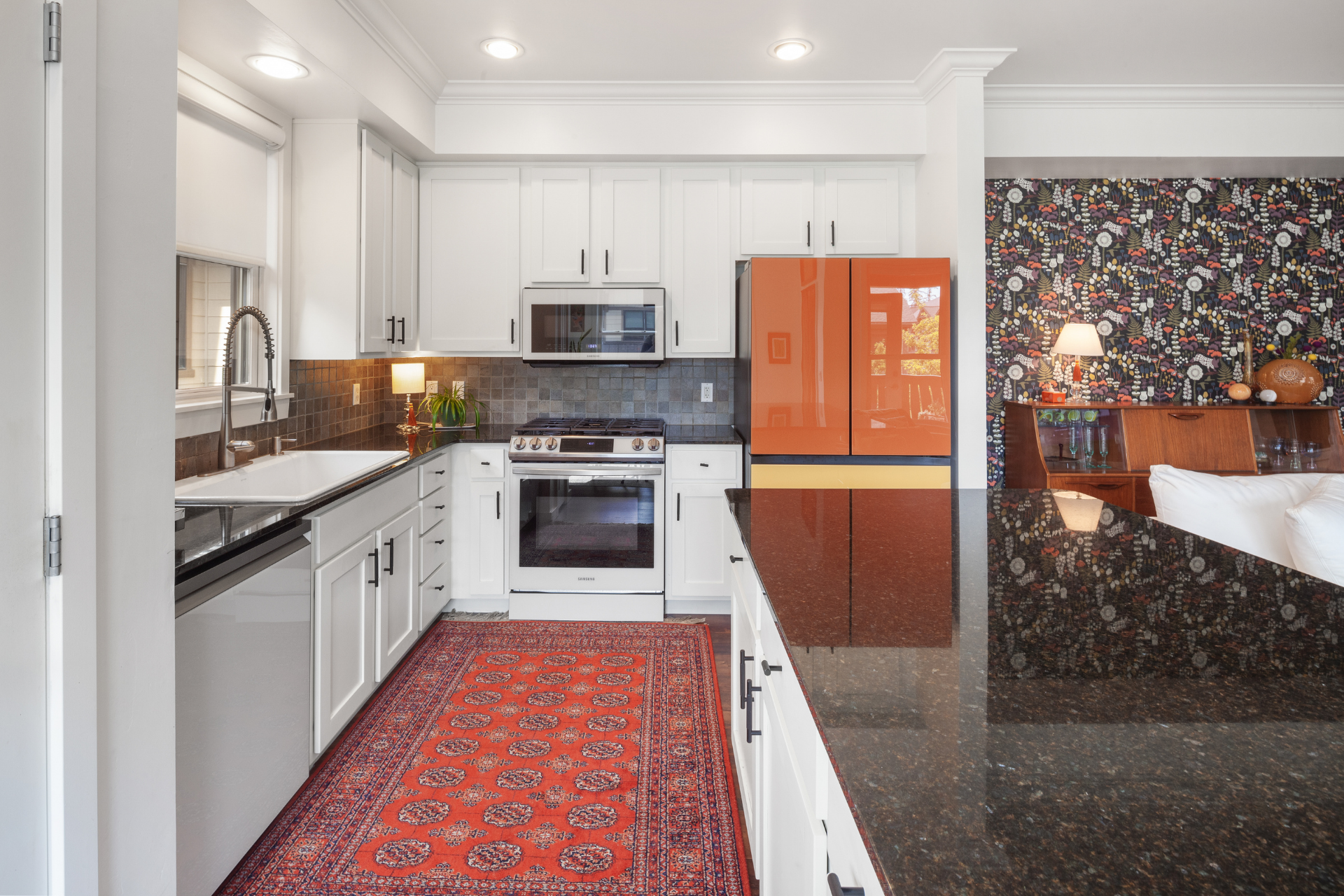 Recent updates include: fresh paint in unit and garage; carpet in primary bedroom and office; vintage wallpaper; stair treads and stair railing; custom wood detail at entry; blinds, including blackout blinds in bedroom and office; wood mantle and open kitchen shelving; Samsung Bespoke refrigerator, freezer, range, microwave, and dishwasher; painted kitchen cabinets with updated hardware and soft-close hinges; new kitchen sink, faucet, and disposal; updated half bath cabinet, sink, and mirror; stackable GE washer and dryer; garage workbench and shelving; asphalt driveway.