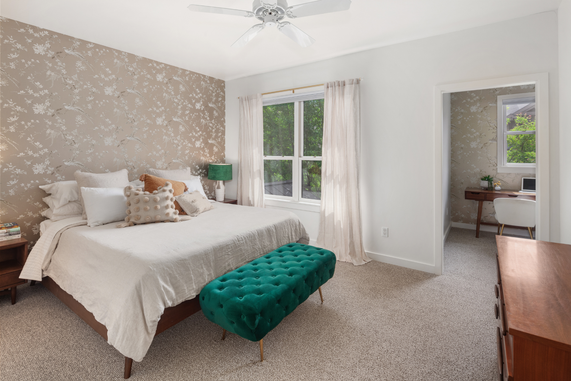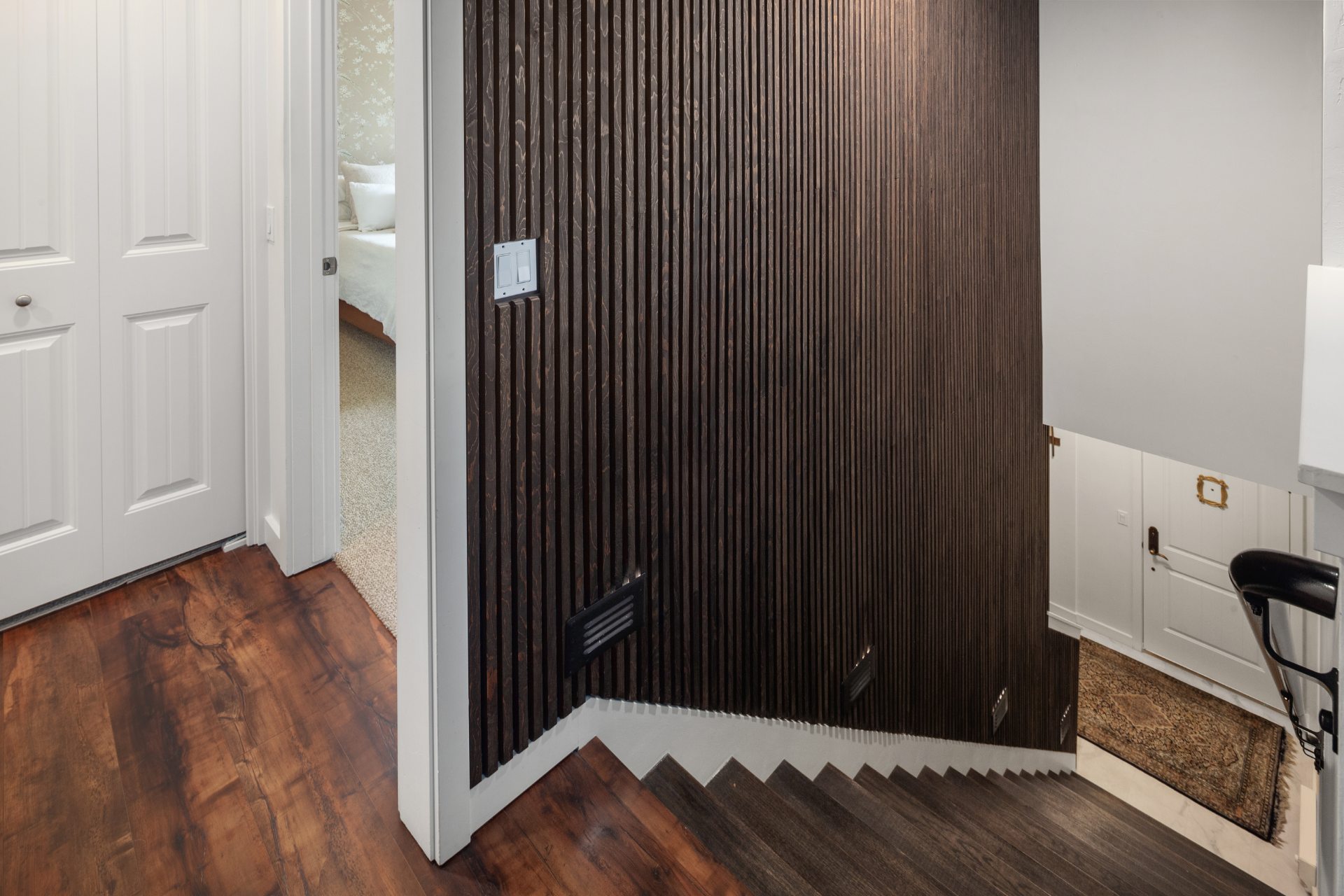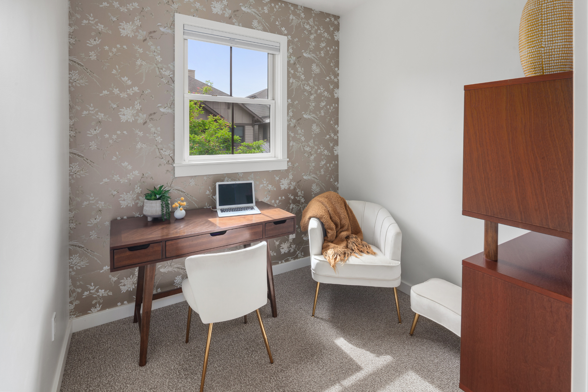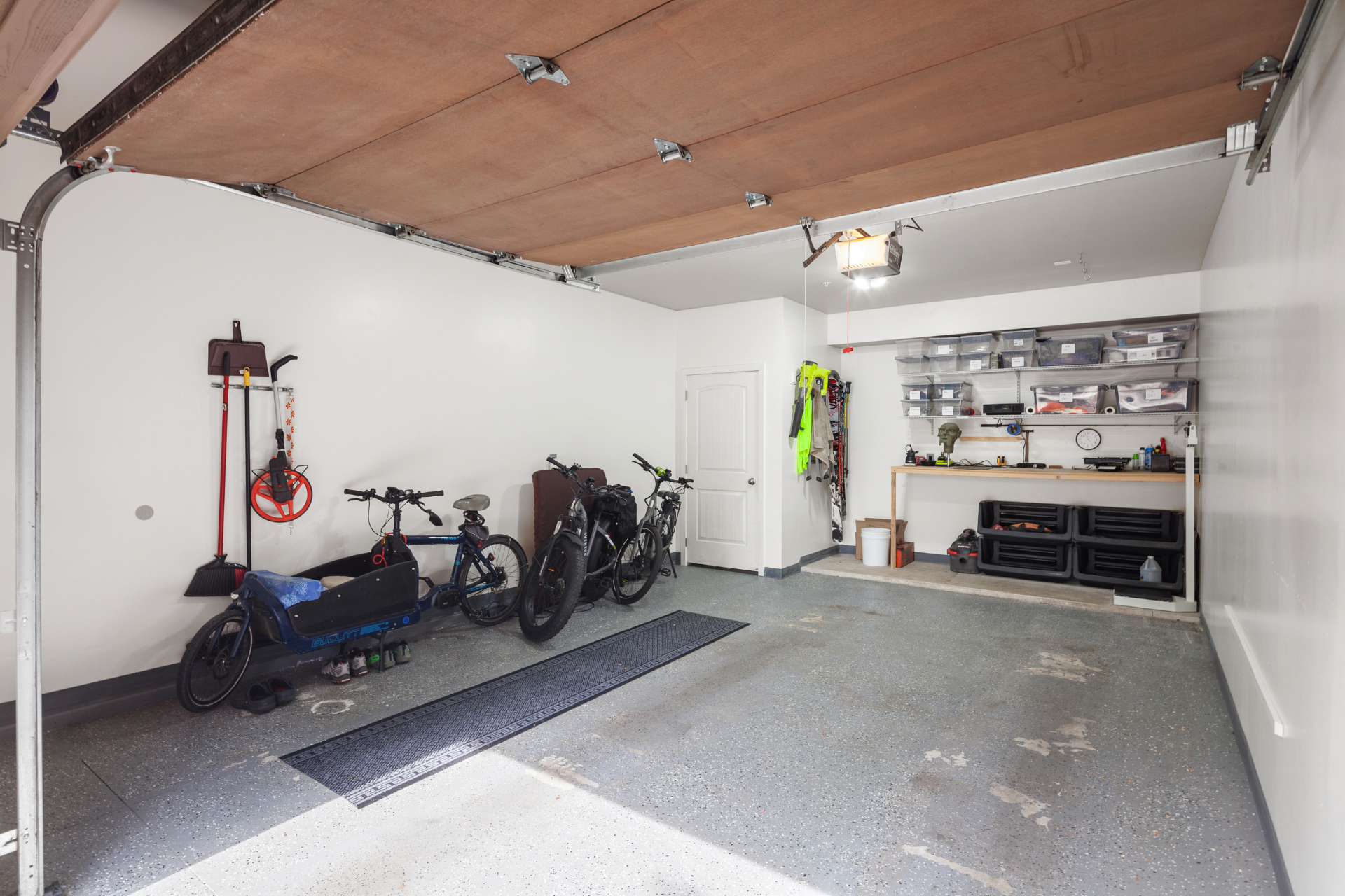 Recent updates include: fresh paint in unit and garage; carpet in primary bedroom and office; vintage wallpaper; stair treads and stair railing; custom wood detail at entry; blinds, including blackout blinds in bedroom and office; wood mantle and open kitchen shelving; Samsung Bespoke refrigerator, freezer, range, microwave, and dishwasher; painted kitchen cabinets with updated hardware and soft-close hinges; new kitchen sink, faucet, and disposal; updated half bath cabinet, sink, and mirror; stackable GE washer and dryer; garage workbench and shelving; asphalt driveway.