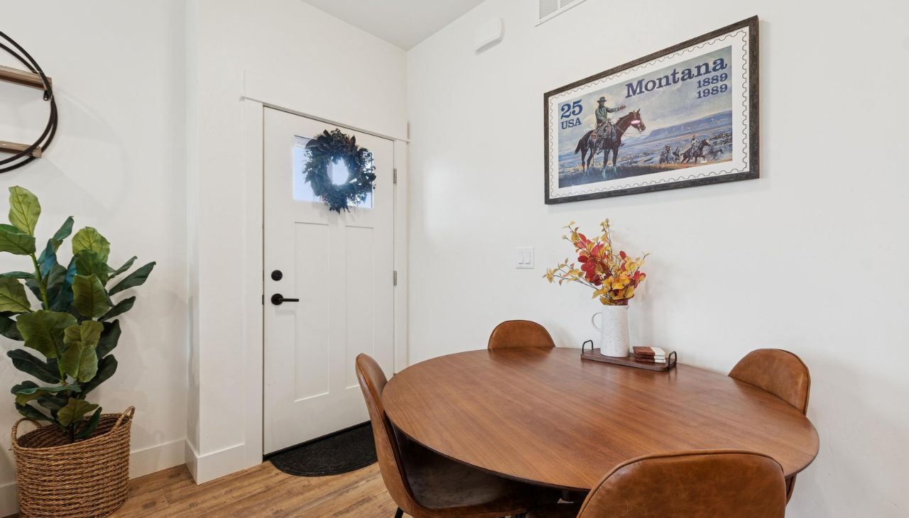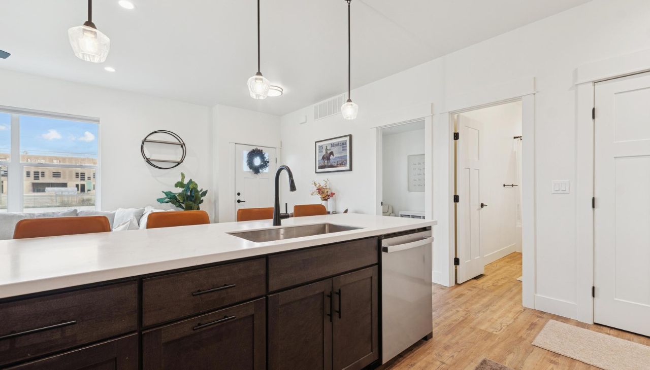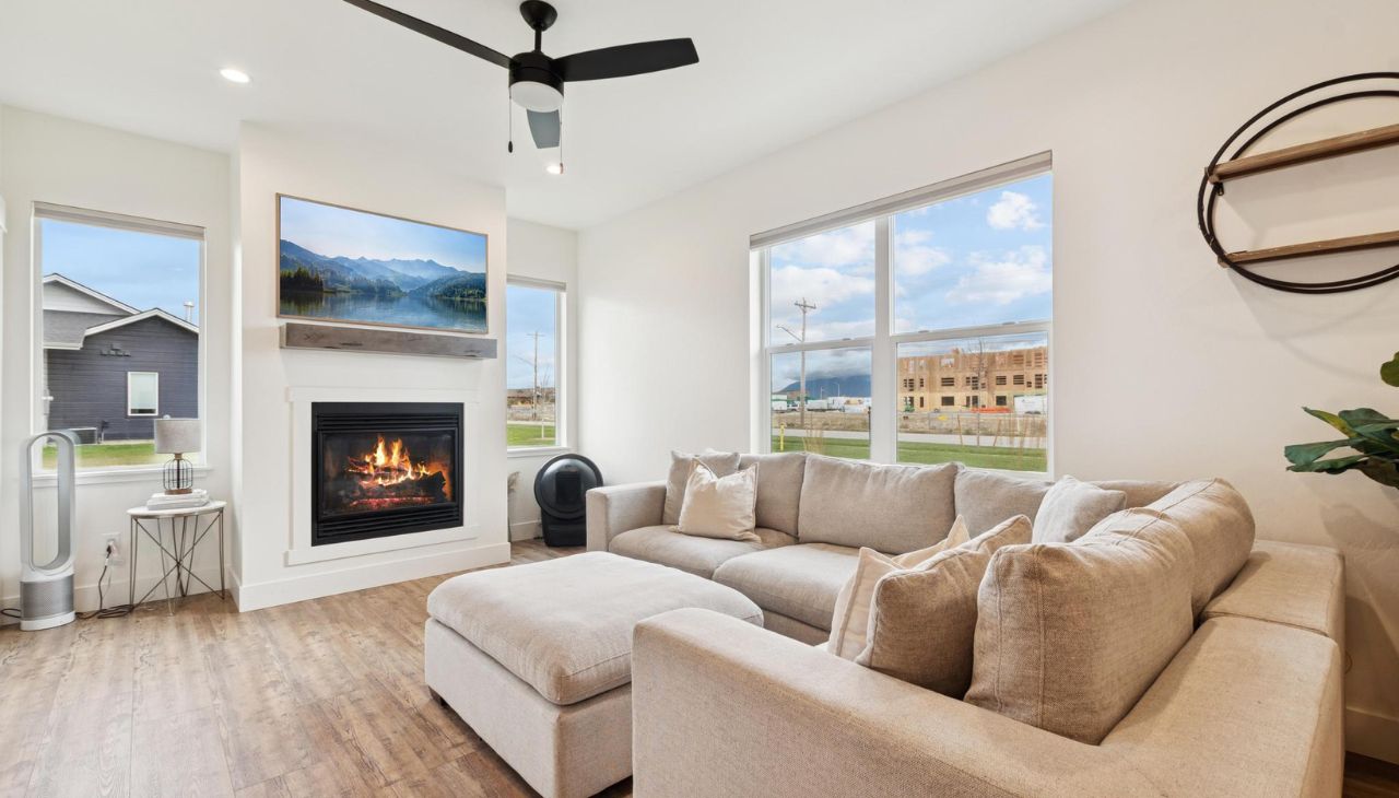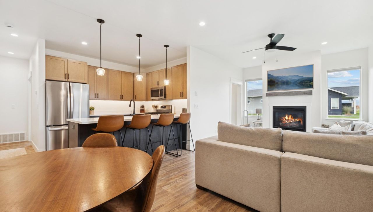 Built in 2024, this like-new single-level home offers modern flair and comfortable living. Featuring 3 bedrooms and 2 baths, this bright home includes large windows, no carpeting, generous closet space, and an open layout. The modern kitchen showcases two-toned cabinets, vinyl plank flooring, and quality finishes throughout. Enjoy a cozy gas fireplace, central air, and the convenience of a washer and dryer included. Samsung frame TV professionally installed above fireplace will convey with property! The large attached garage is accessible from the alley. Located in a great neighborhood with walking trails and close to major shopping, Glacier International Airport, Glacier High School and downtown Kalispell — a perfect blend of modern design and prime location! Don’t miss this single-level living gem!