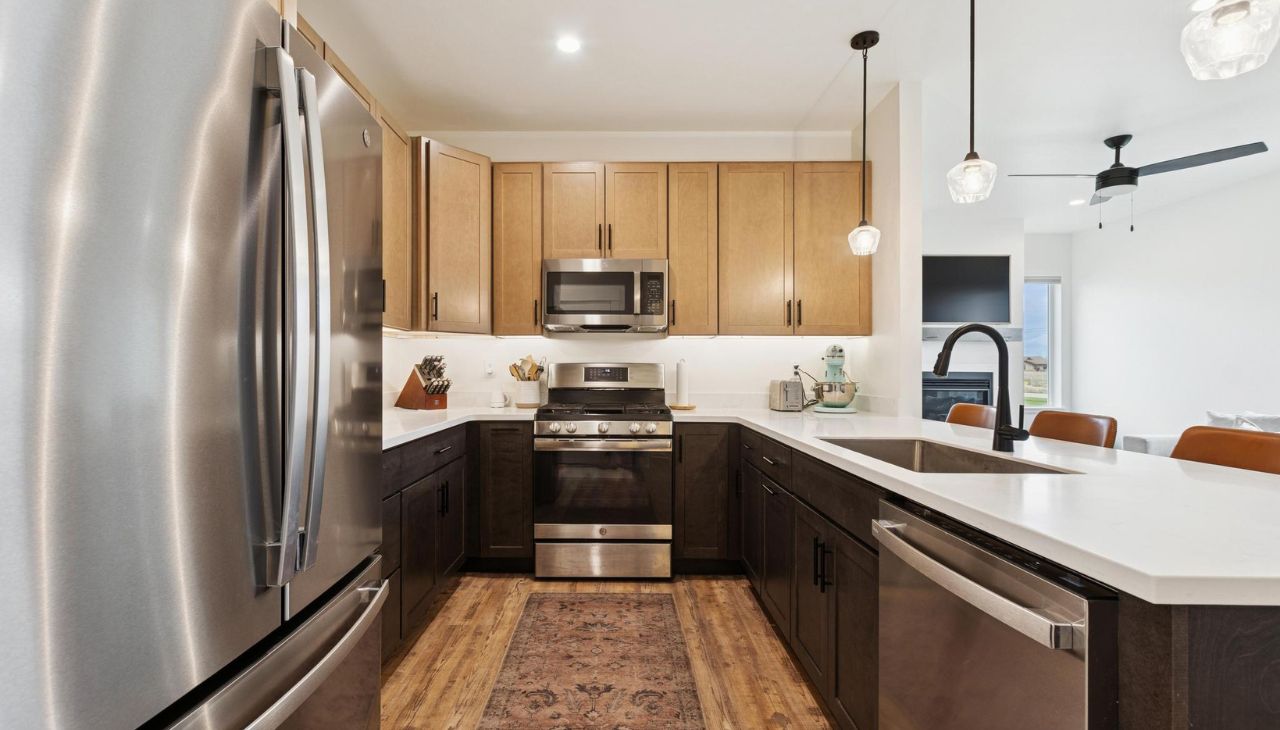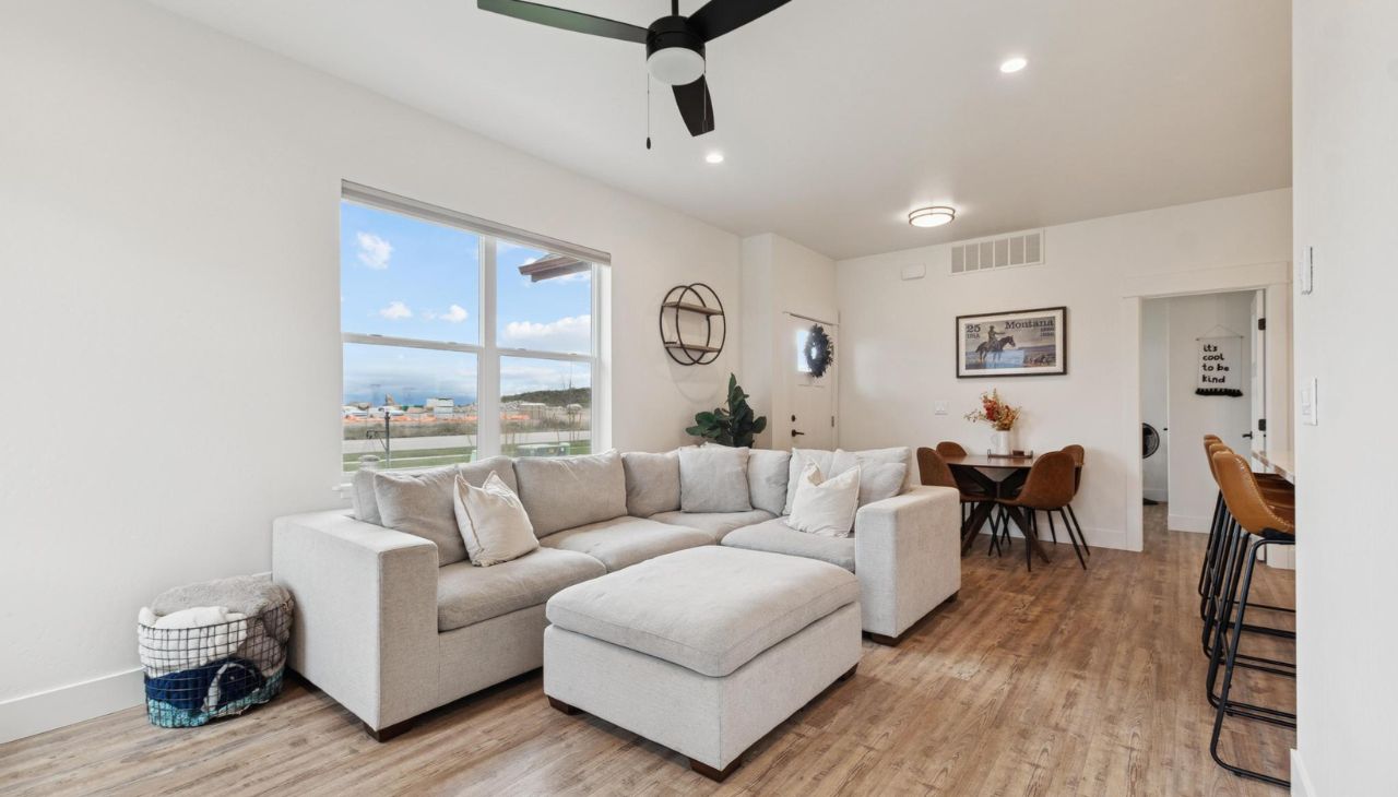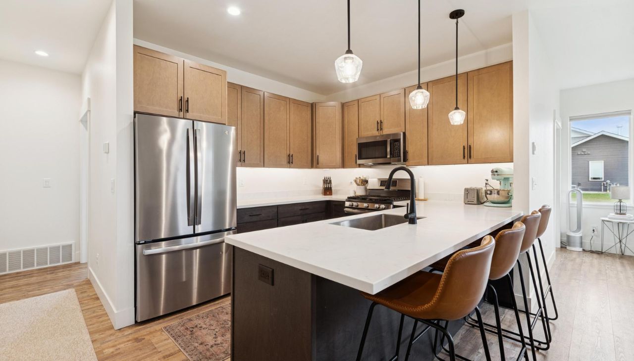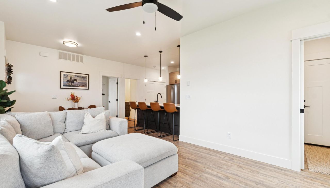Built in 2024, this like-new single-level home offers modern flair and comfortable living. Featuring 3 bedrooms and 2 baths, this bright home includes large windows, no carpeting, generous closet space, and an open layout. The modern kitchen showcases two-toned cabinets, vinyl plank flooring, and quality finishes throughout. Enjoy a cozy gas fireplace, central air, and the convenience of a washer and dryer included. Samsung frame TV professionally installed above fireplace will convey with property! The large attached garage is accessible from the alley. Located in a great neighborhood with walking trails and close to major shopping, Glacier International Airport, Glacier High School and downtown Kalispell — a perfect blend of modern design and prime location! Don’t miss this single-level living gem!